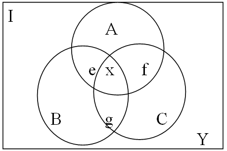 如上图所示,这个模型表示的含义是:一个班一共有学生I人,喜欢语文的有A人,喜欢数学的有B人,喜欢英语的有C人,只喜欢语文和数学的有e人,只喜欢语文和英语的有f人,只喜欢数学和英语的有g人,三科都喜欢的有X人,三科都不喜欢的有Y人,对于这个模型可以表示为I = A + B + C - ( e + f + g ) -2X + Y,对于这个式子一定要明白每一个量表示的是什么意思,这样做题的时候就容易知道让我们求得量是谁,到时候直接套公式就行了。