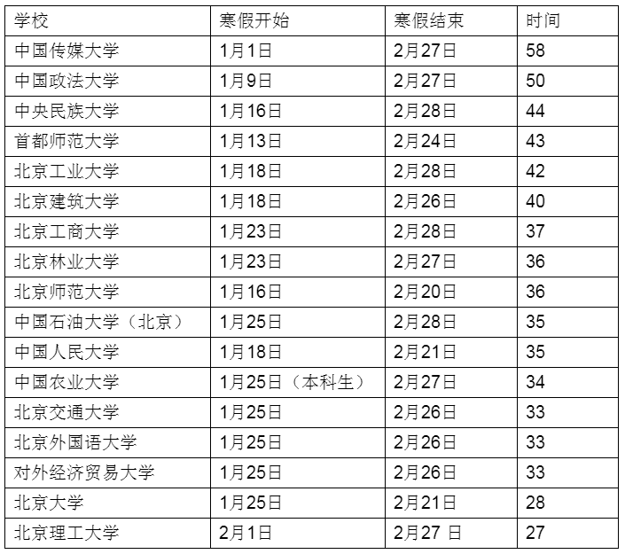 这些学校寒假结束时间大多集中于2月底。从寒假天数来看,中国传媒大学一共58天,排在第一;紧随其后的是中国政法大学,共50天;中央民族大学、首都师范大学、北京工业大学均超过40天;北京工商大学、北京林业大学、中国人民大学、中国农业大学、北京交通大学等校寒假为30多天;北京大学仅有28天;北京理工大学为27天。